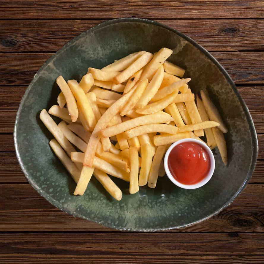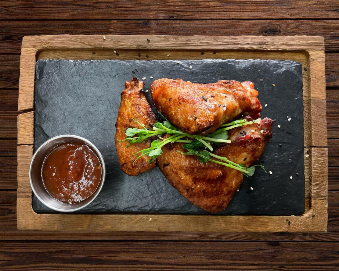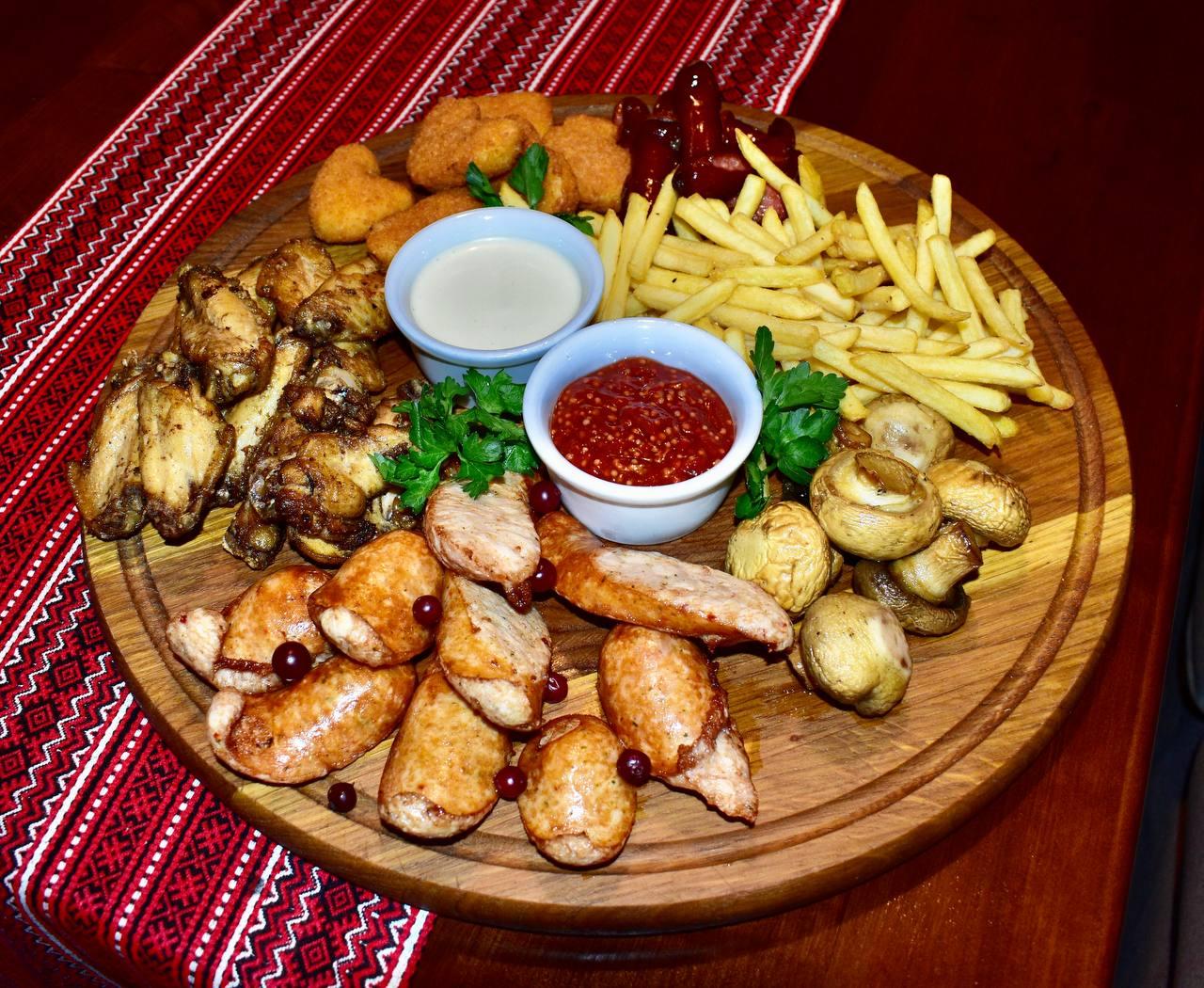 ковбаски курячі, крильця курячі, нагетси, єгерські ковбаски, картопля фрі, печериці, соуси вершково-часниковий і чилі