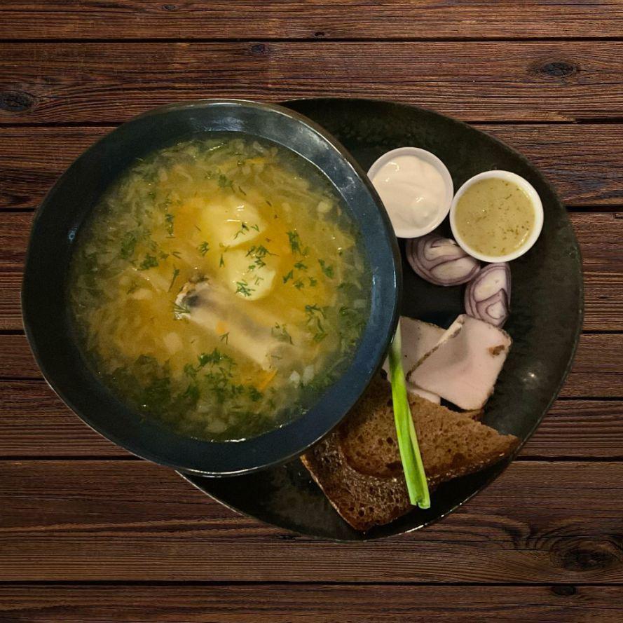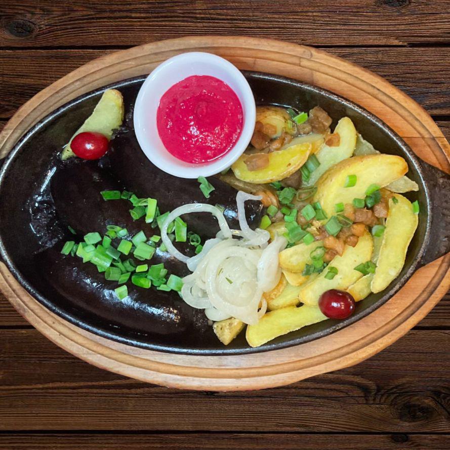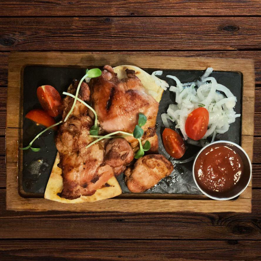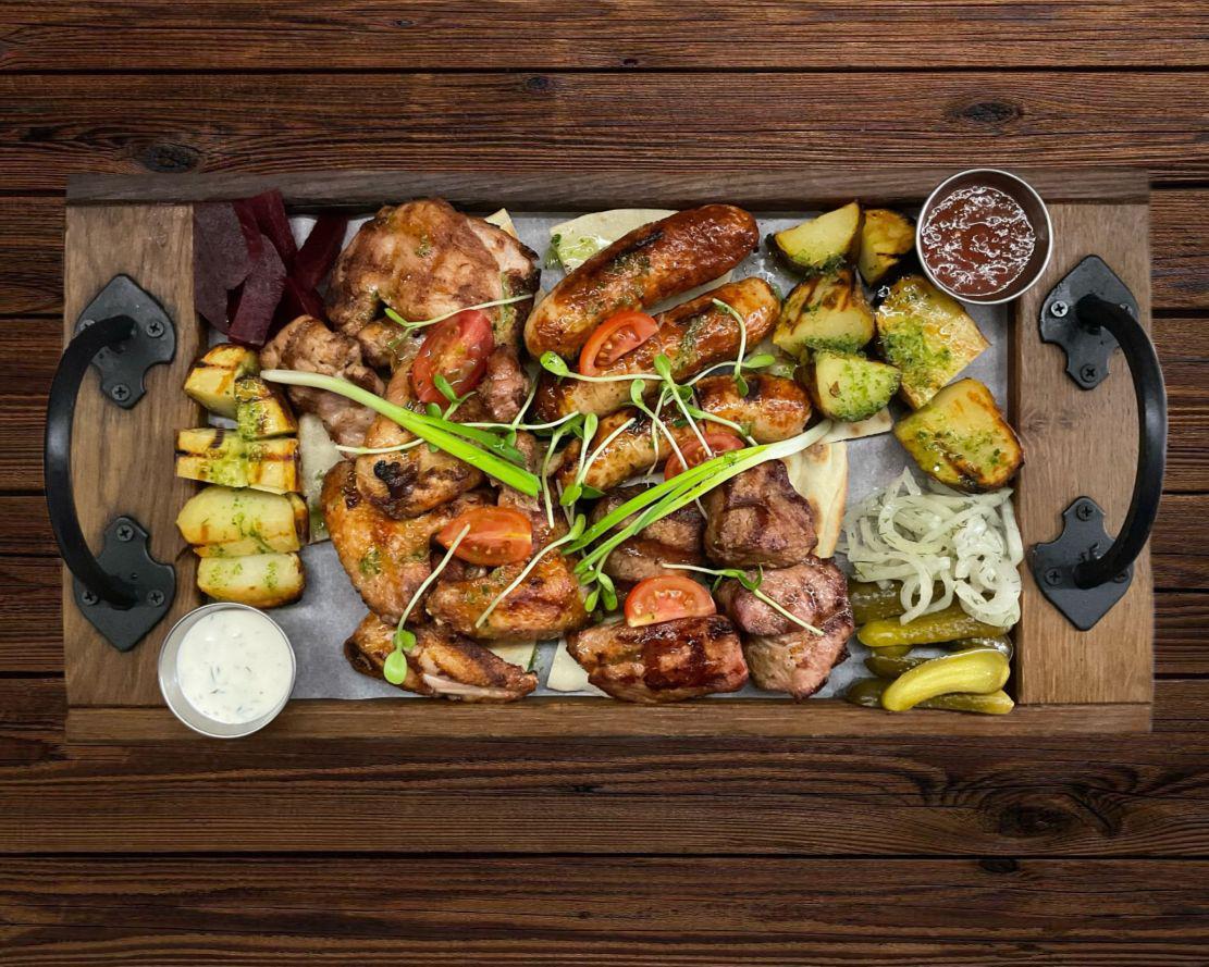 шашлик свинячий, шашлик курячий, ковбаски курячі, крильця курячі, огірочки з бочки, буряк маринований, картопля печена, паляниця, соуси шашличний та вершково-часниковий