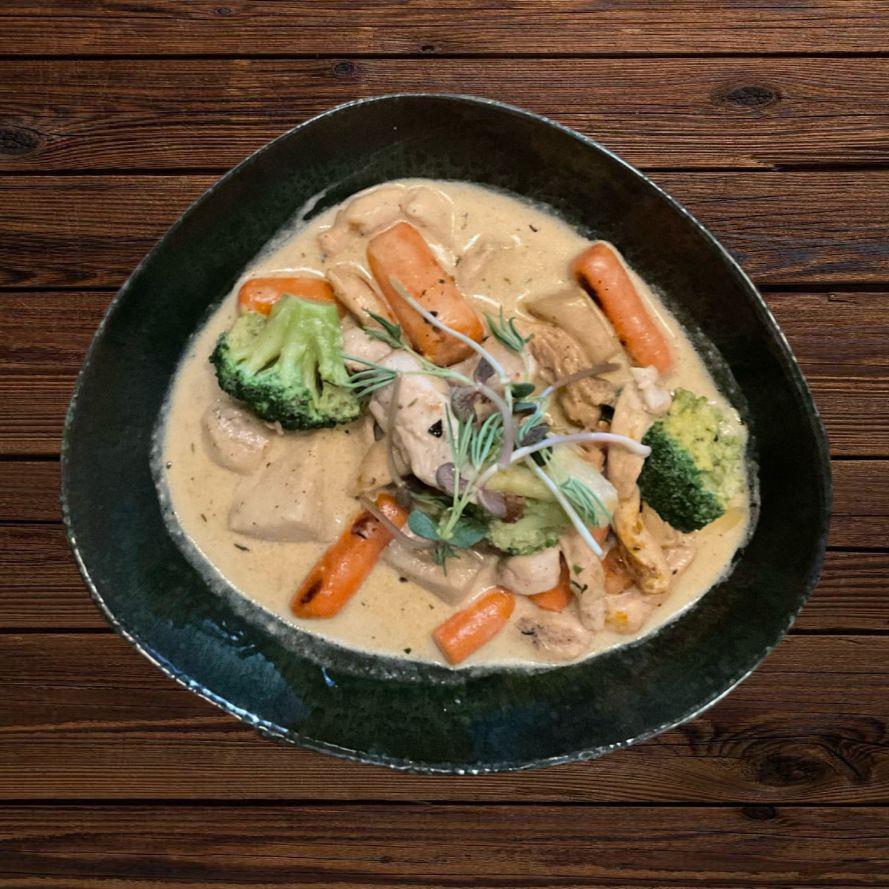 броколі, морква бейбі, білі гриби, куряче філе, вершки