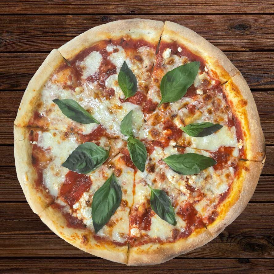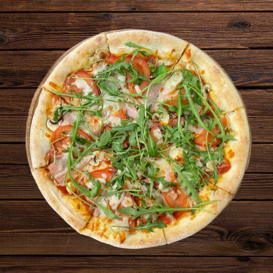 сир моцарела, шинка копчена свина, печериці, рукола, помідор, томатна основа