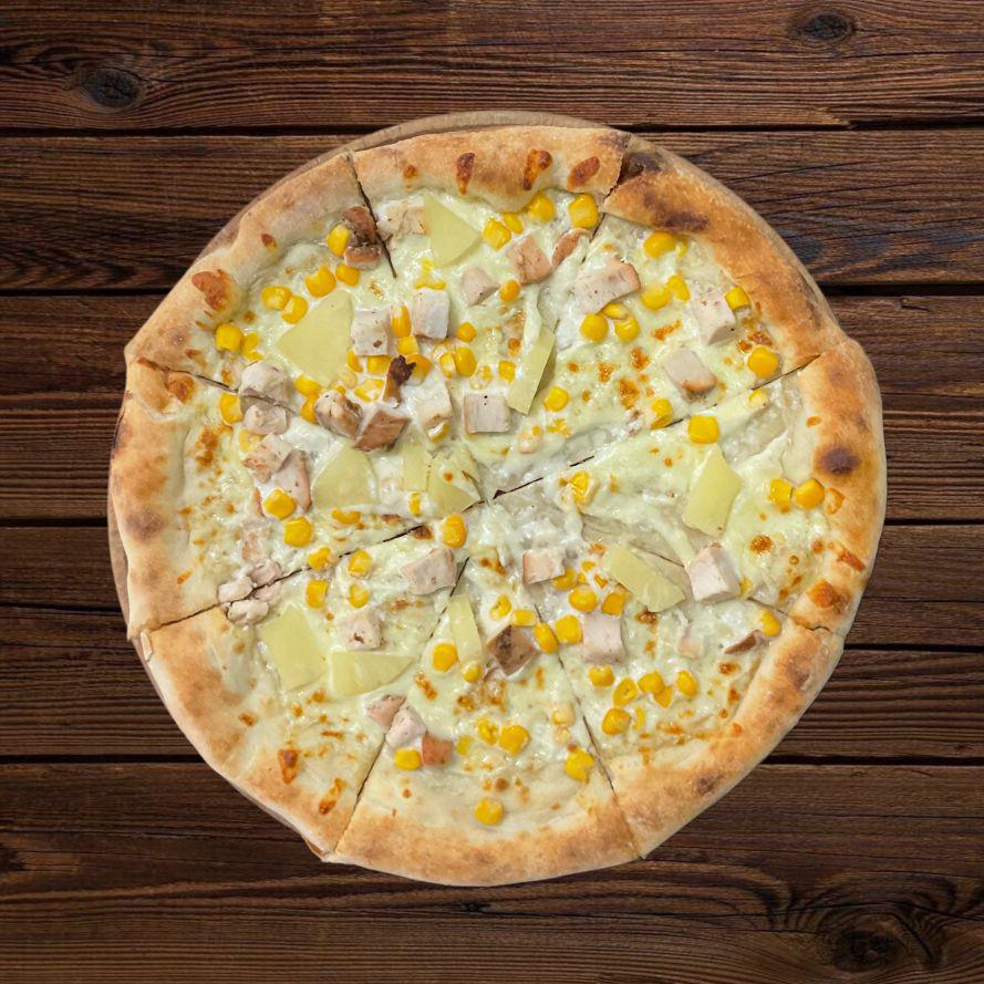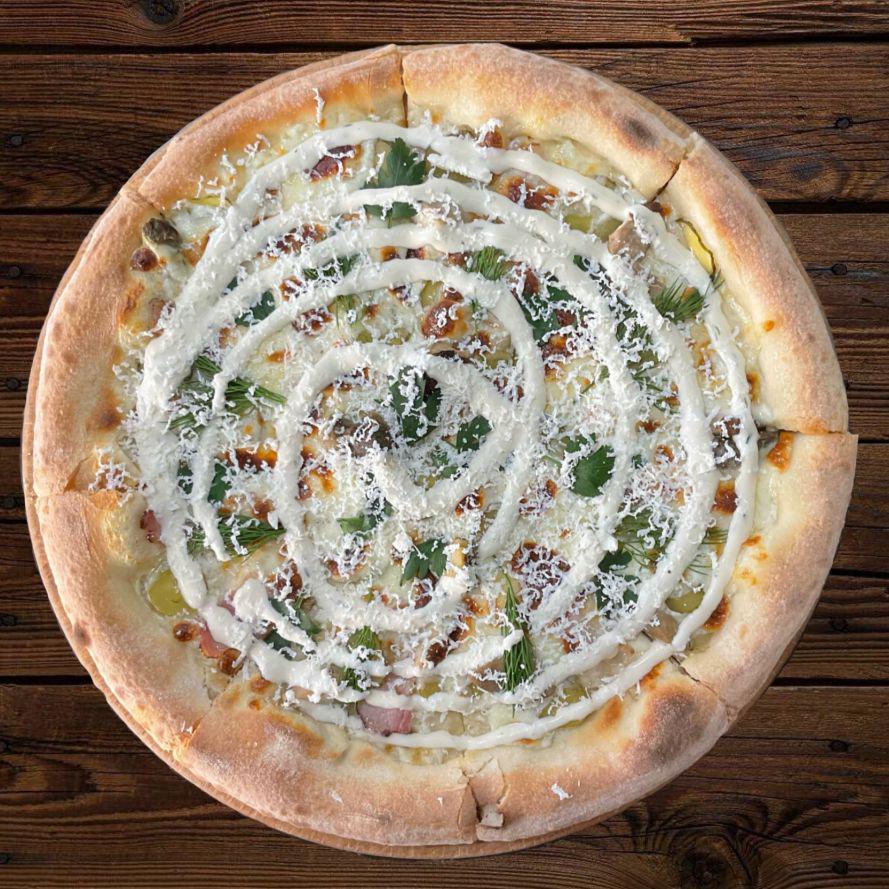 мисливські ковбаски, печериці, перець болгарський, сир моцарелла, соус цезар, вершкова основа