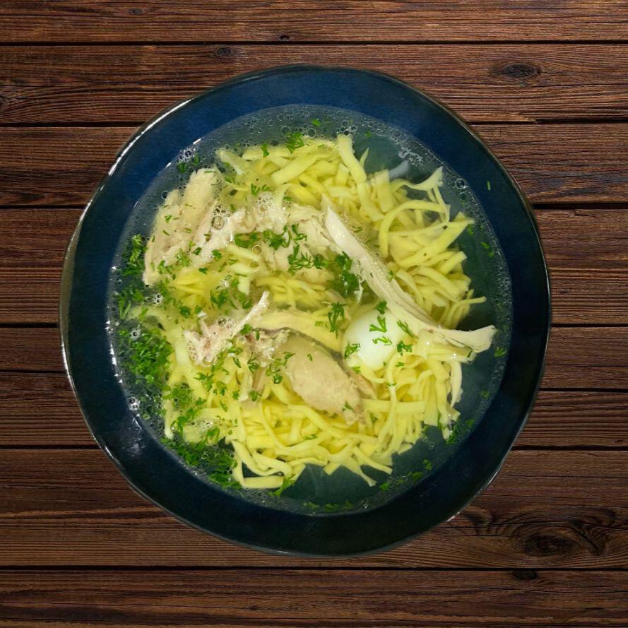 м'ясо куряче, бульйон, домашня локшина,морква, перепелине яйце, зелень
