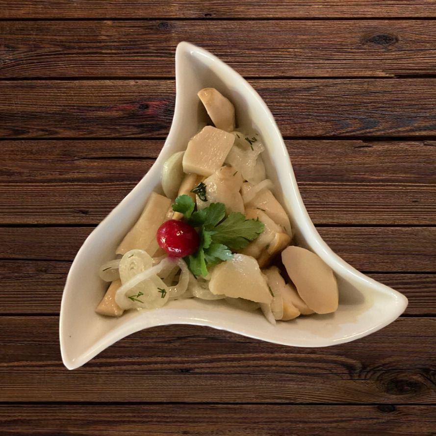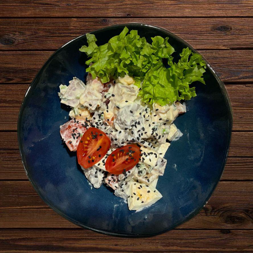 сир моцарелла, підчеревина копчена, огірок квашений, гриби білі, бринза зелень, вершково-часниковий соус
