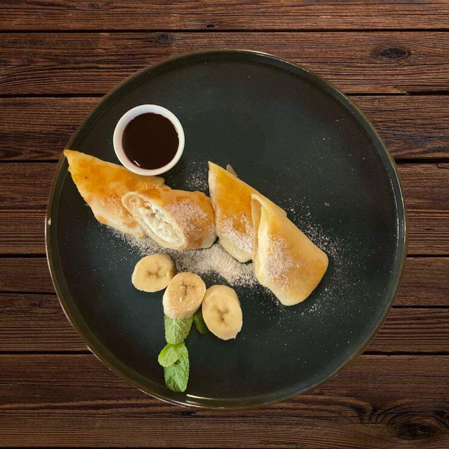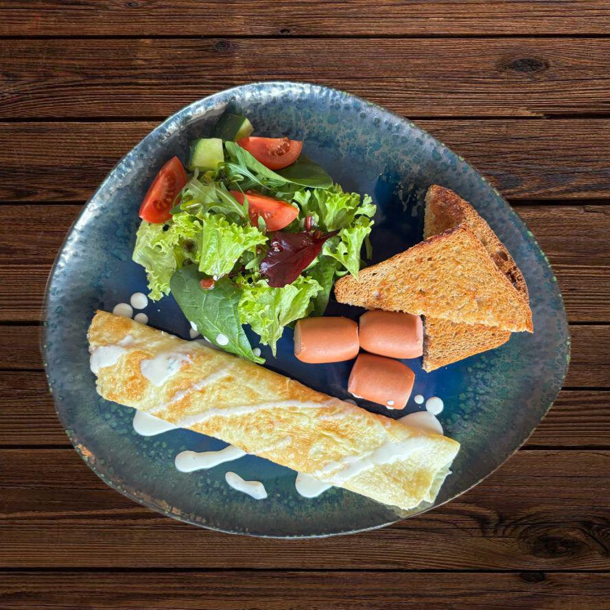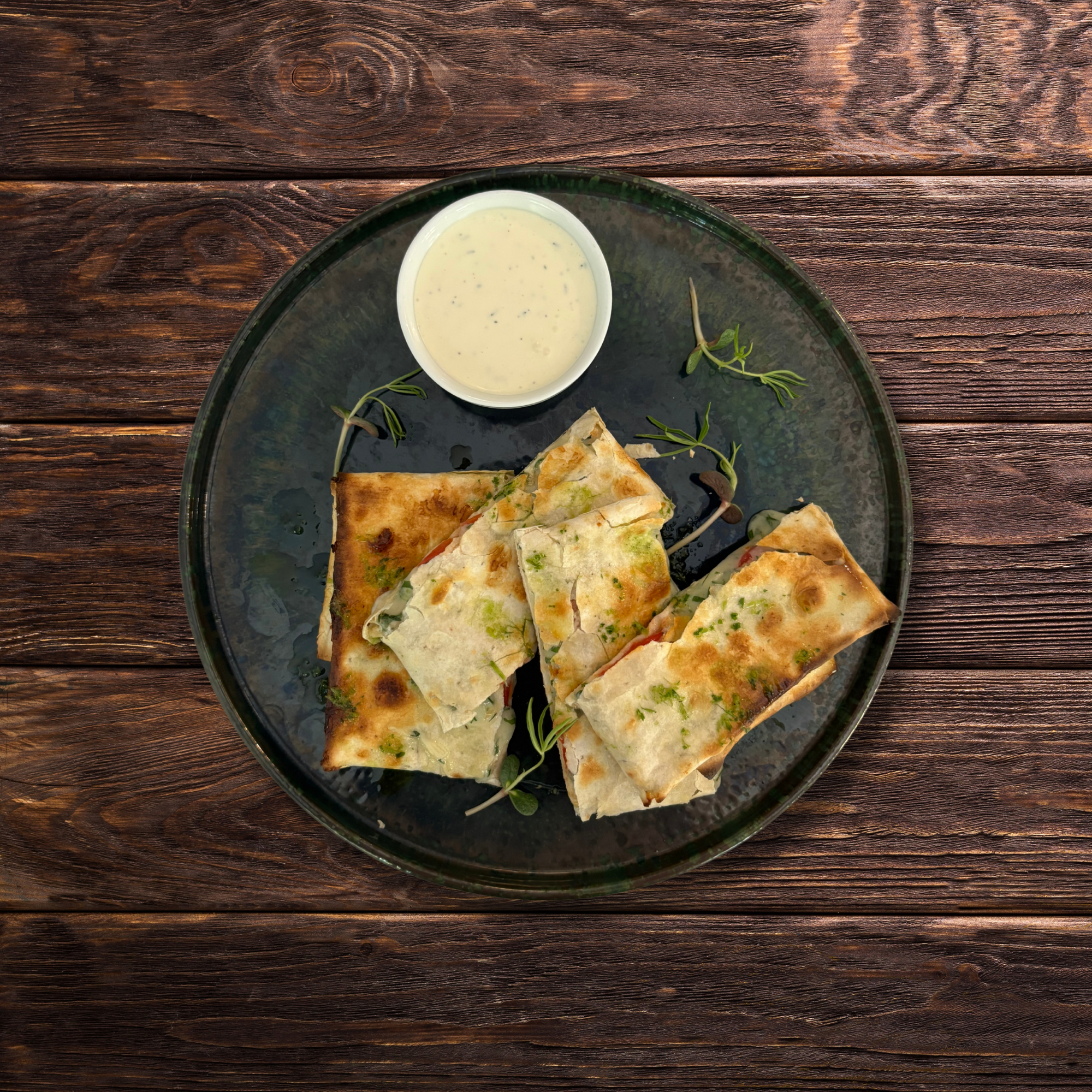 Лаваш, сулугуні, моцарела, помідора, зелень, вершково-часниковий соус