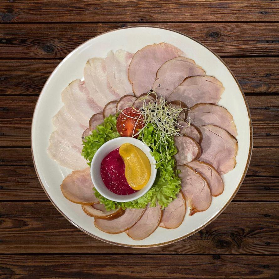 шинка копчена свиняча, ковбаса домашня, полядвиця яловича запечена, підчеревина копчена, соуси хрін та гірчиця