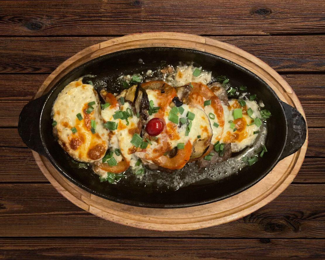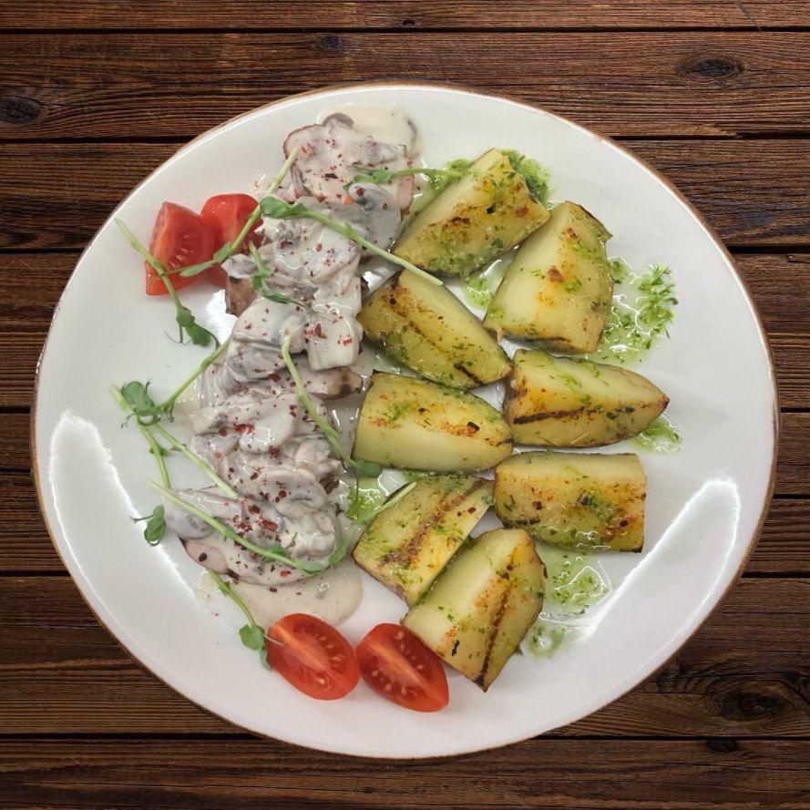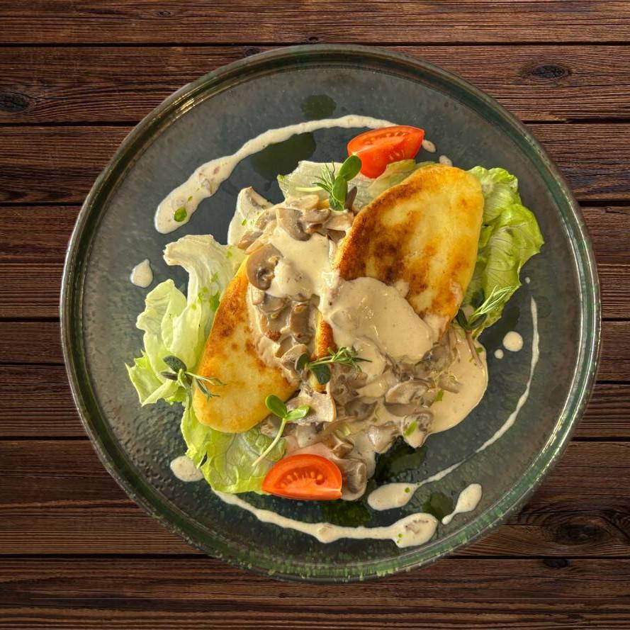 свинина, гриби білі, сир моцарела, вершкова основа, вершково-часниковий соус