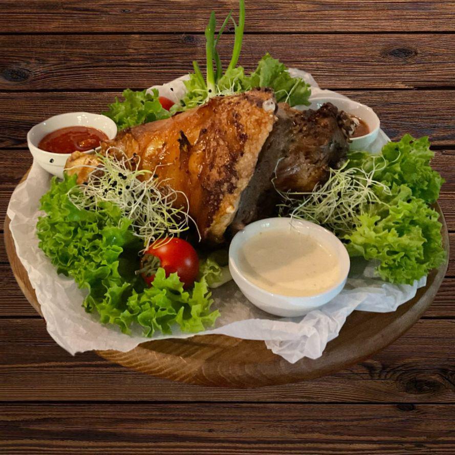 свиняча рулька, соуси шашличний, чилі та вершково-часниковий
