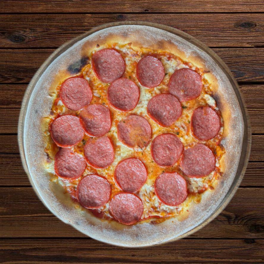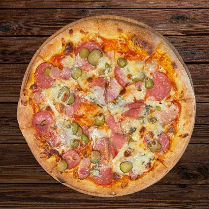 дор блю, моцарелла, огірок квашений, салямі, підчеревина копчена, томатна основа