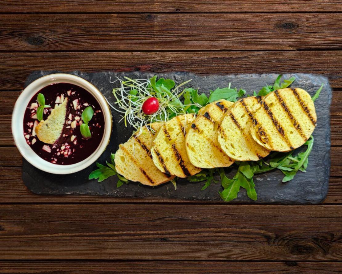 паштет курячий, хліб медово-пшеничний, рукола, пармезан, арахіс, вишневий соус