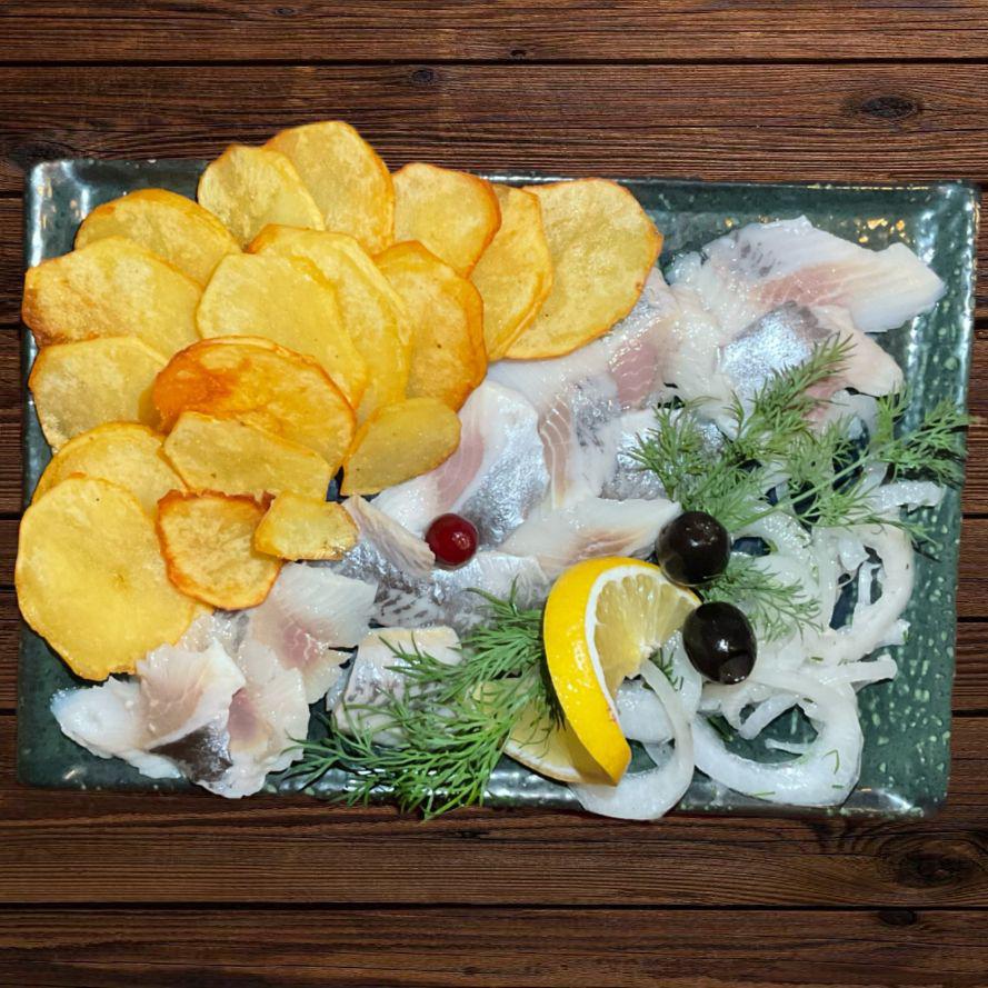 філе оселедця, картопля смажена, цибуля маринована, маслини, зелень, лимон