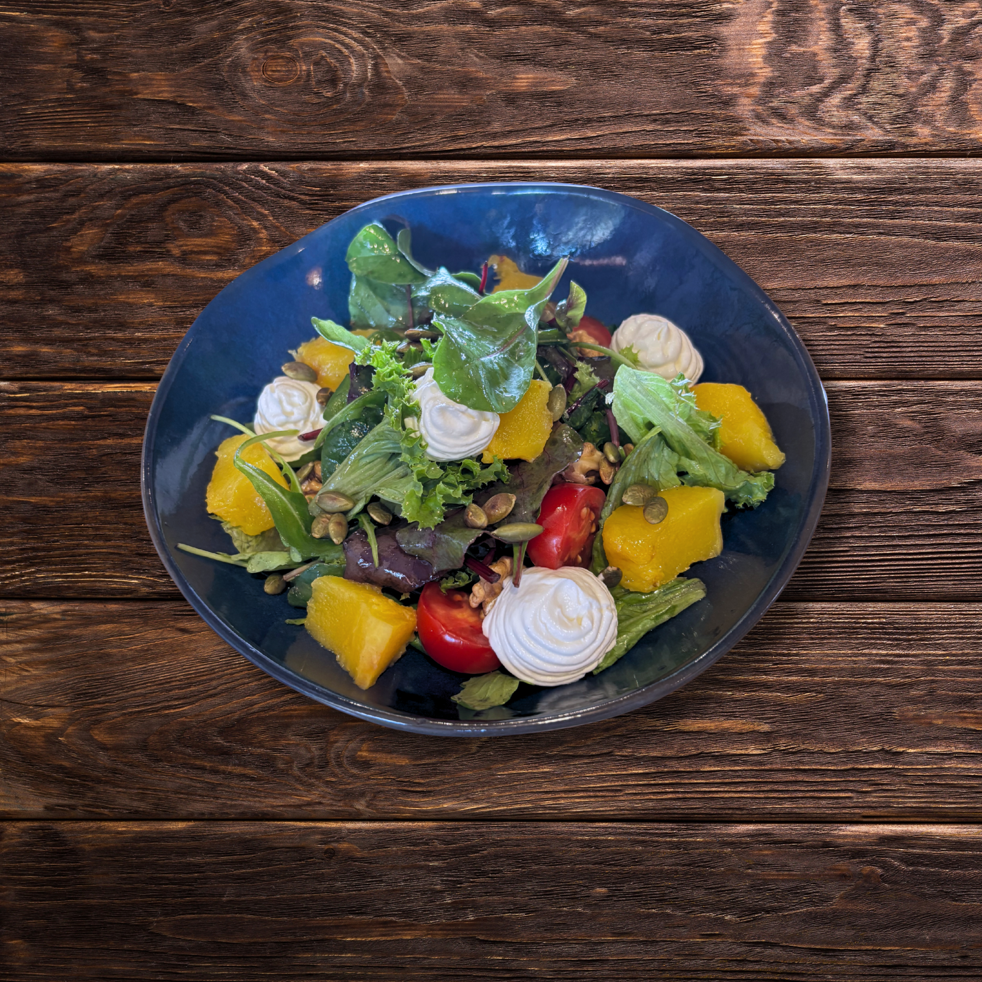 Гарбуз, помідор чері, мікс салату, горіх грецький, гарбузове насіння, олія оливкова, оцет бальзамічний