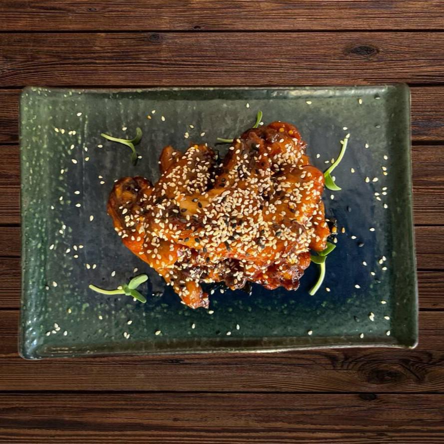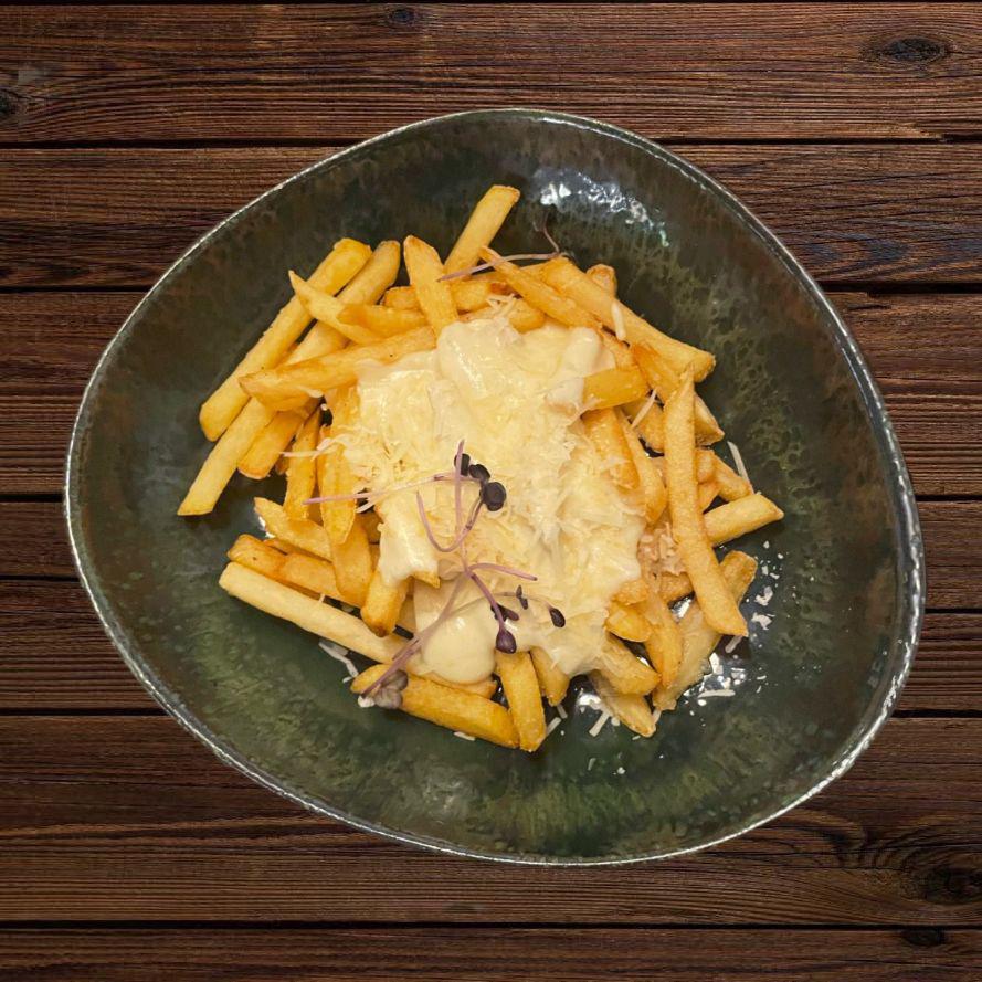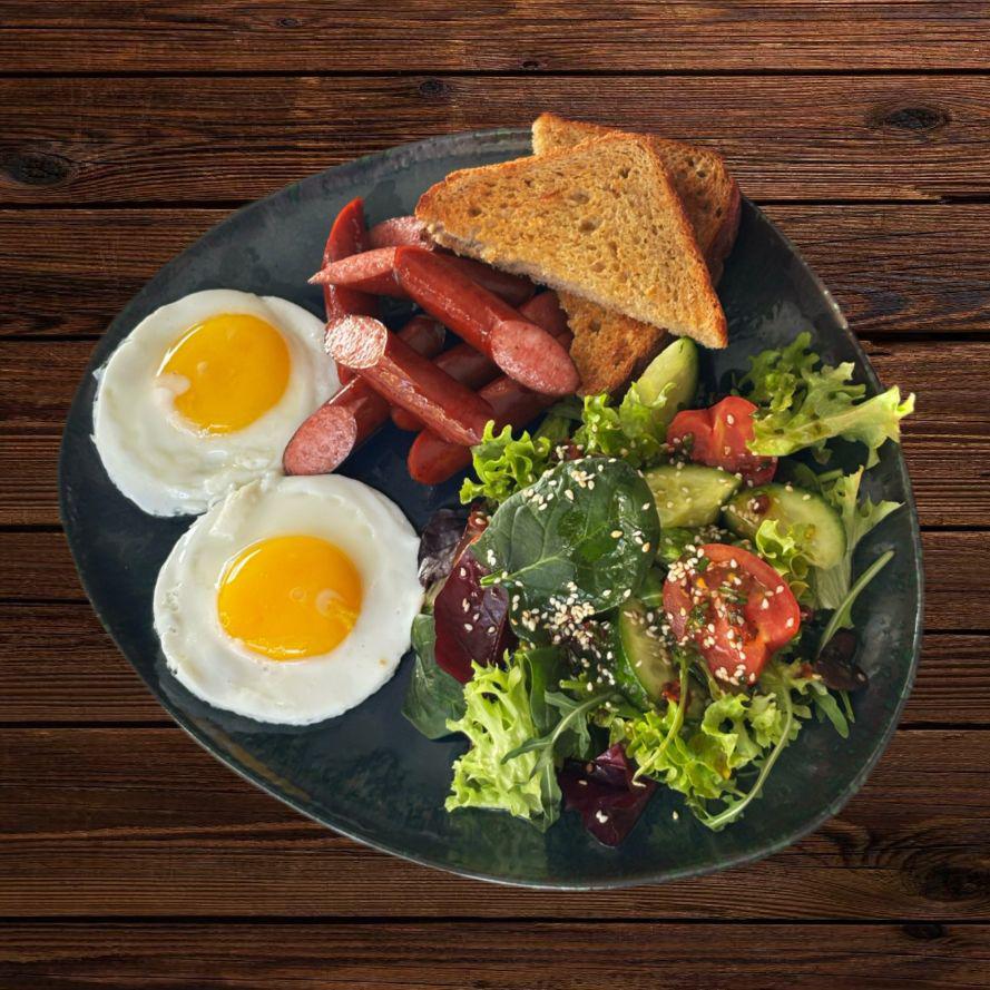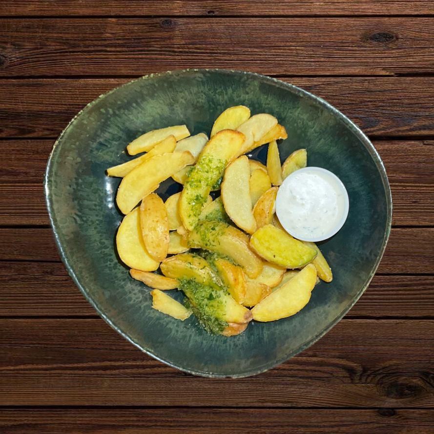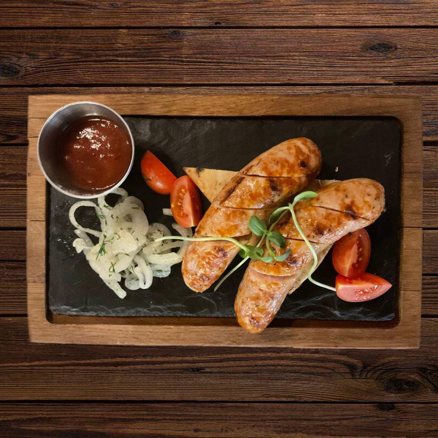 ковбаски курячі, крильця курячі, нагетси, єгерські ковбаски, картопля фрі, печериці, соуси вершково-часниковий і чилі