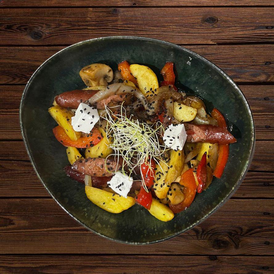 печериці, картопля, єгерські ковбаски,фета, перець болгарський,цибуля