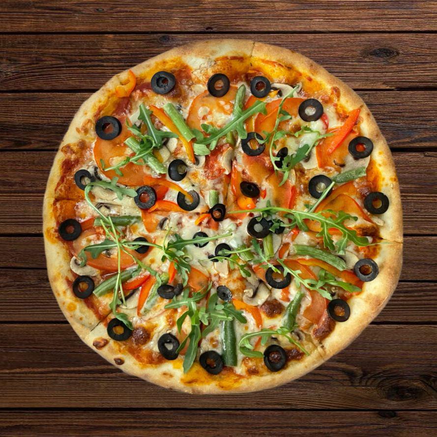 помідор, печериці, перець болгарський, стручкова квасоля, маслини, сир моцарела, томатна основа