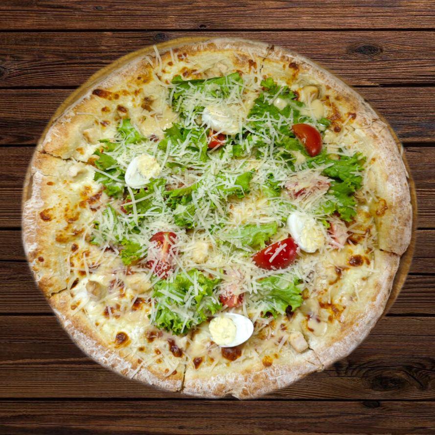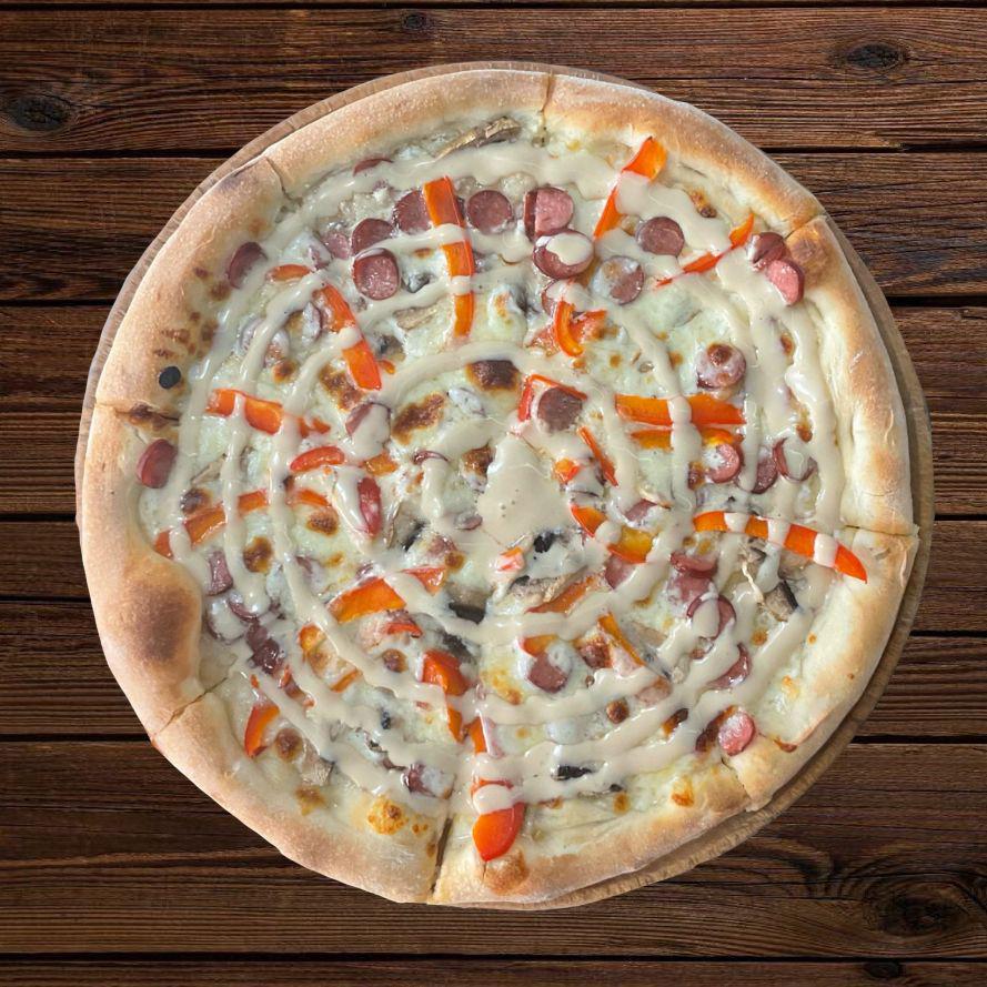 мисливські ковбаски, печериці, перець болгарський, сир моцарелла, соус цезар, вершкова основа
