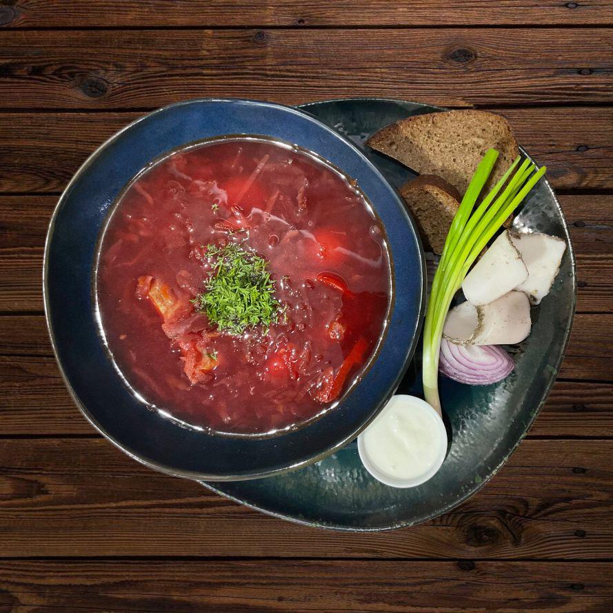 оселедець маринований, сало червоне, чорне, мелене, огірок квашений, буряк маринований,грінки з бородинського та медово-пшеничного хлібу, цибуля, часник