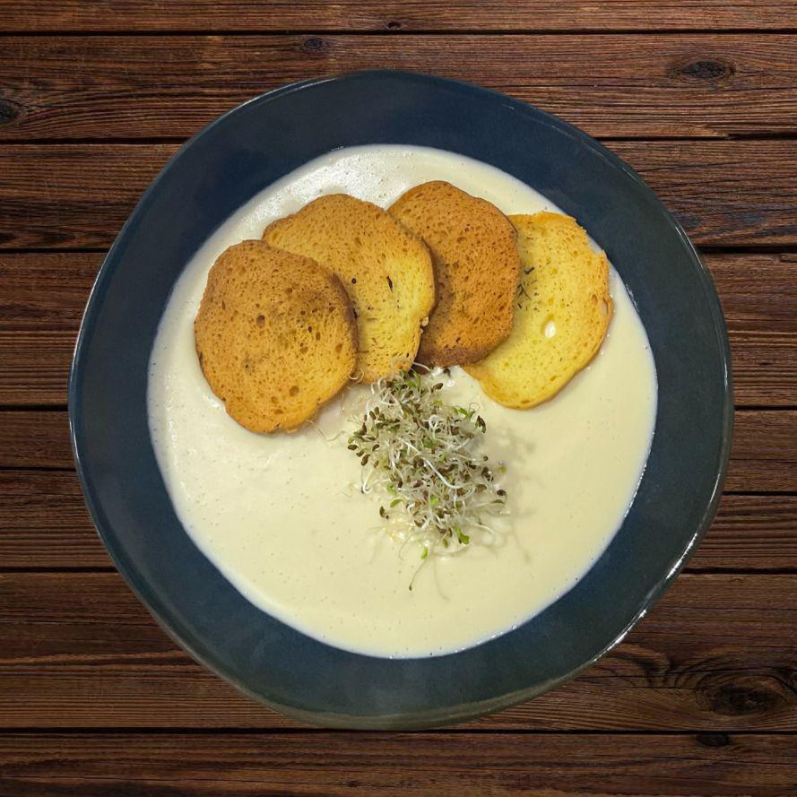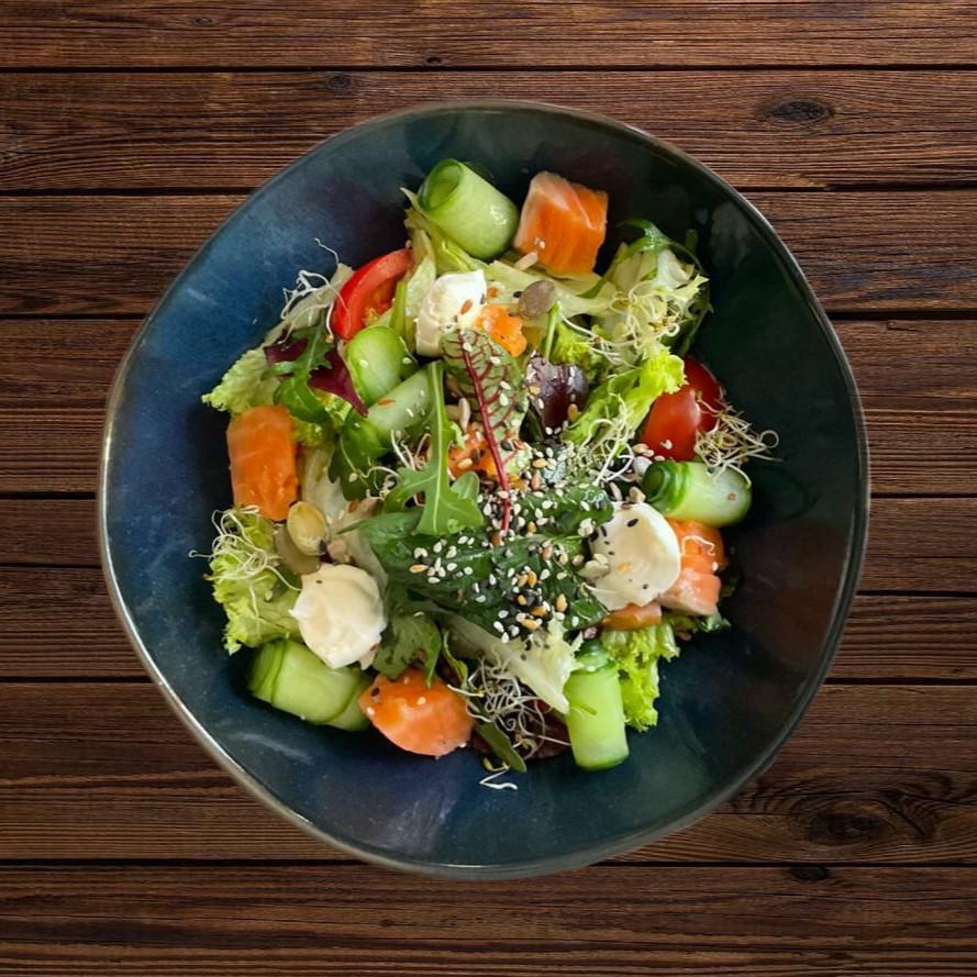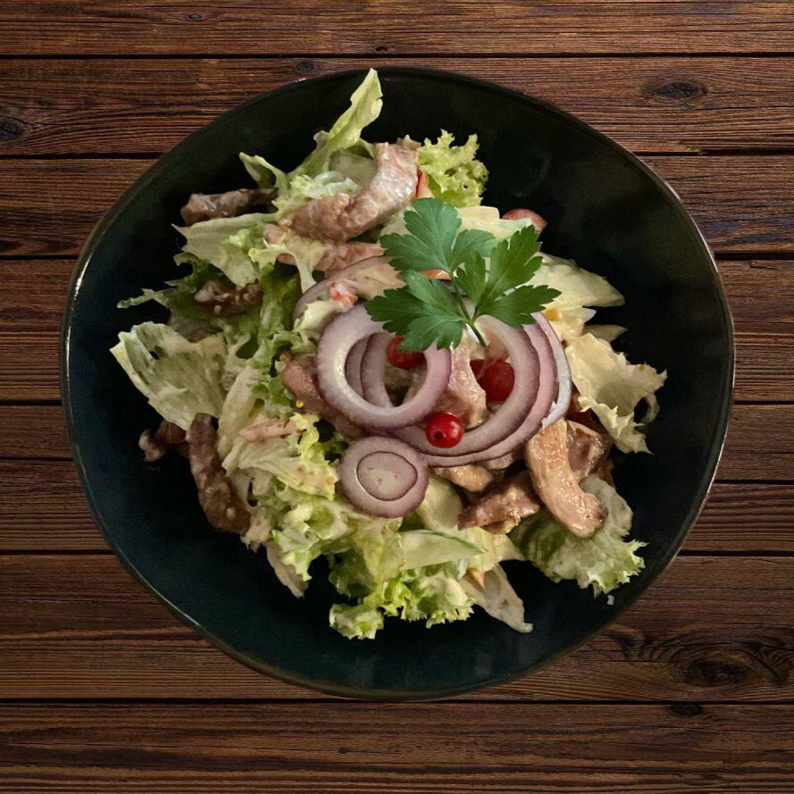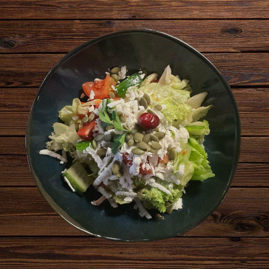 сир моцарелла, підчеревина копчена, огірок квашений, гриби білі, бринза зелень, вершково-часниковий соус