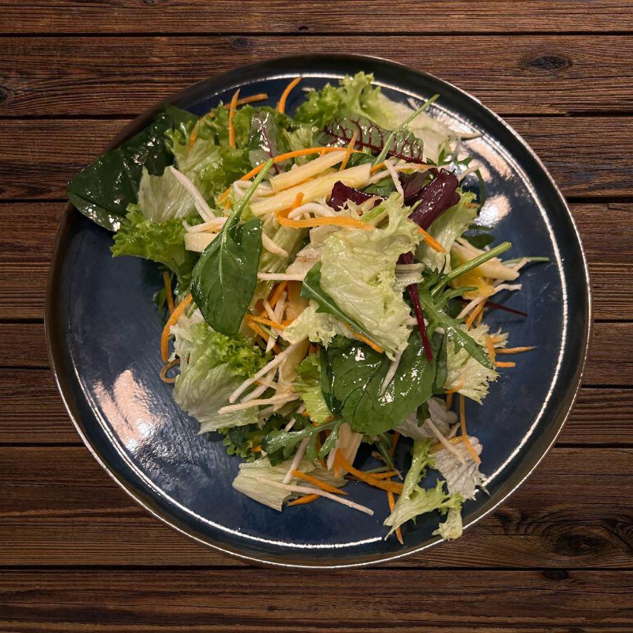 листя салату, яблуко, морква, корінь селери, рукола, каперси, апельсинова заправка