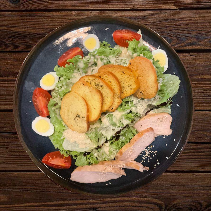 куряче філе, пармезан,помідори чері, крутони, перепелині яйця, листя салату, соус Цезар