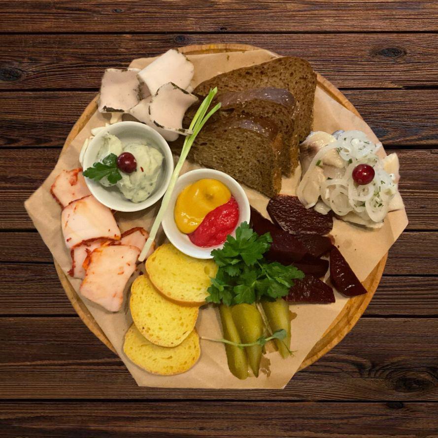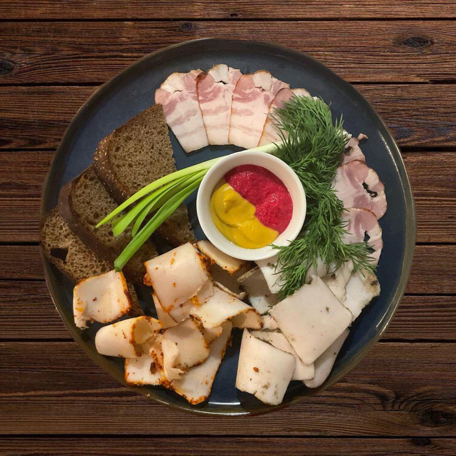 шинка копчена свиняча, ковбаса домашня, полядвиця яловича запечена, підчеревина копчена, соуси хрін та гірчиця
