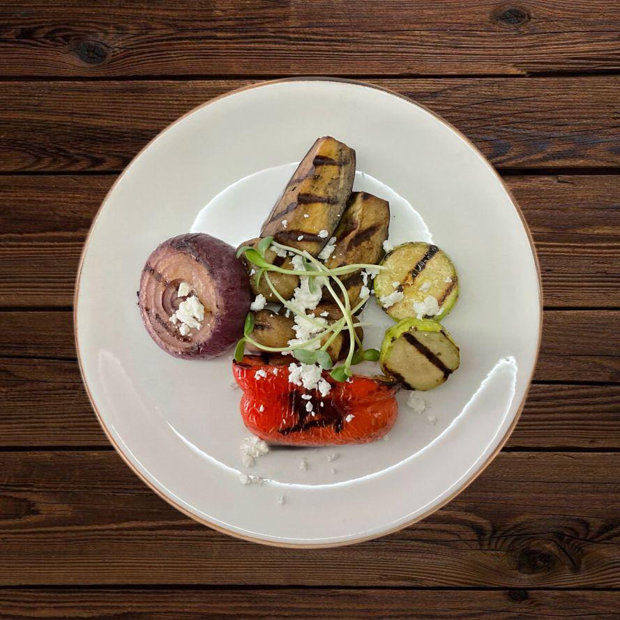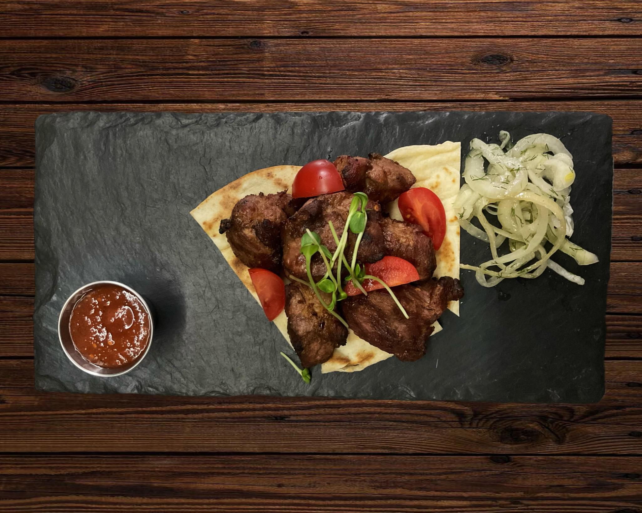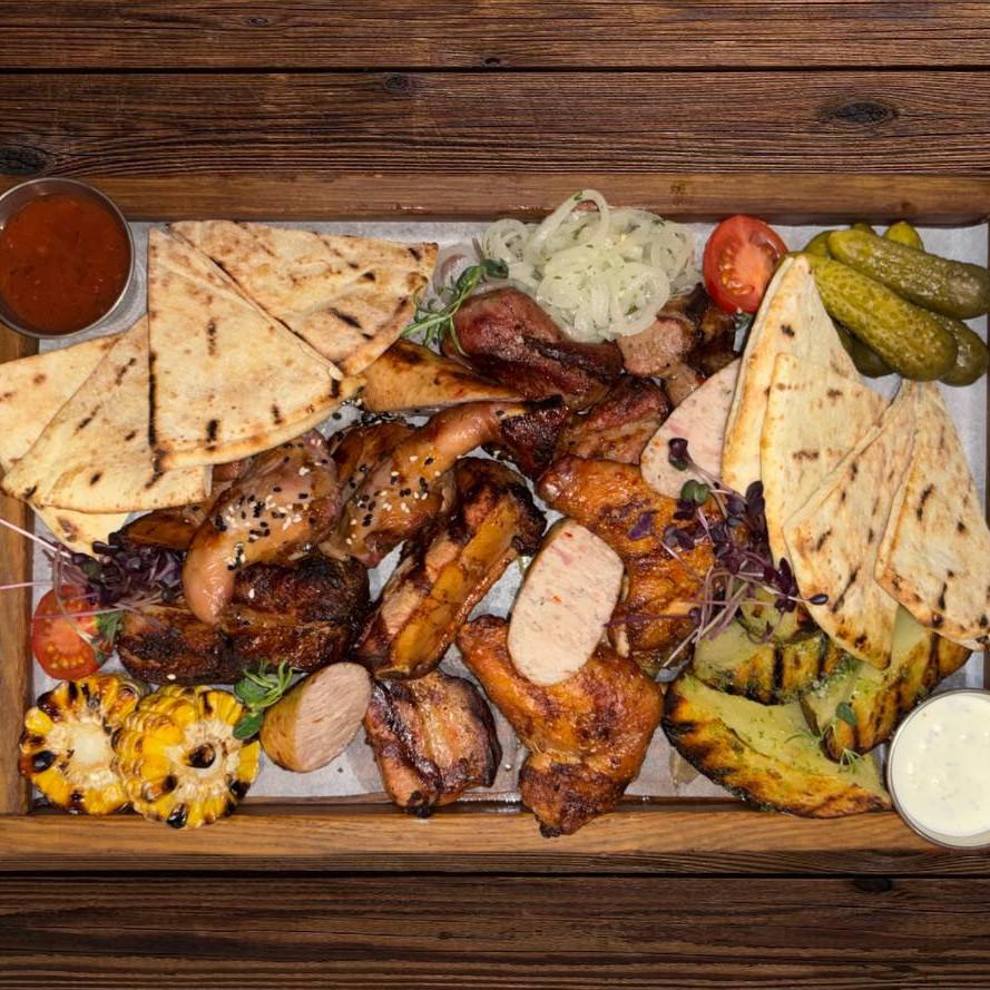 шашлик свинячий, шашлик курячий, ковбаски курячі, крильця курячі, огірочки з бочки, буряк маринований, картопля печена, паляниця, соуси шашличний та вершково-часниковий