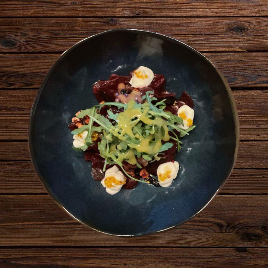 буряк запечений, в'ялений чорнослив, фета, карамелізований горіх, рукола