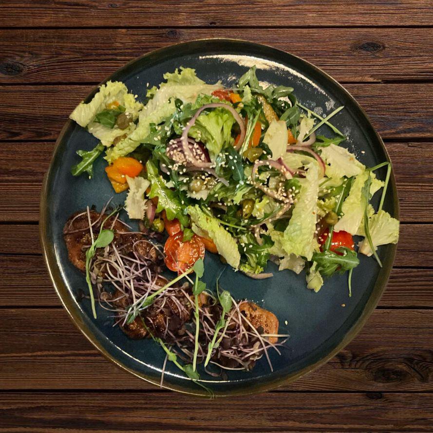 Гарбуз, помідор чері, мікс салату, горіх грецький, гарбузове насіння, олія оливкова, оцет бальзамічний