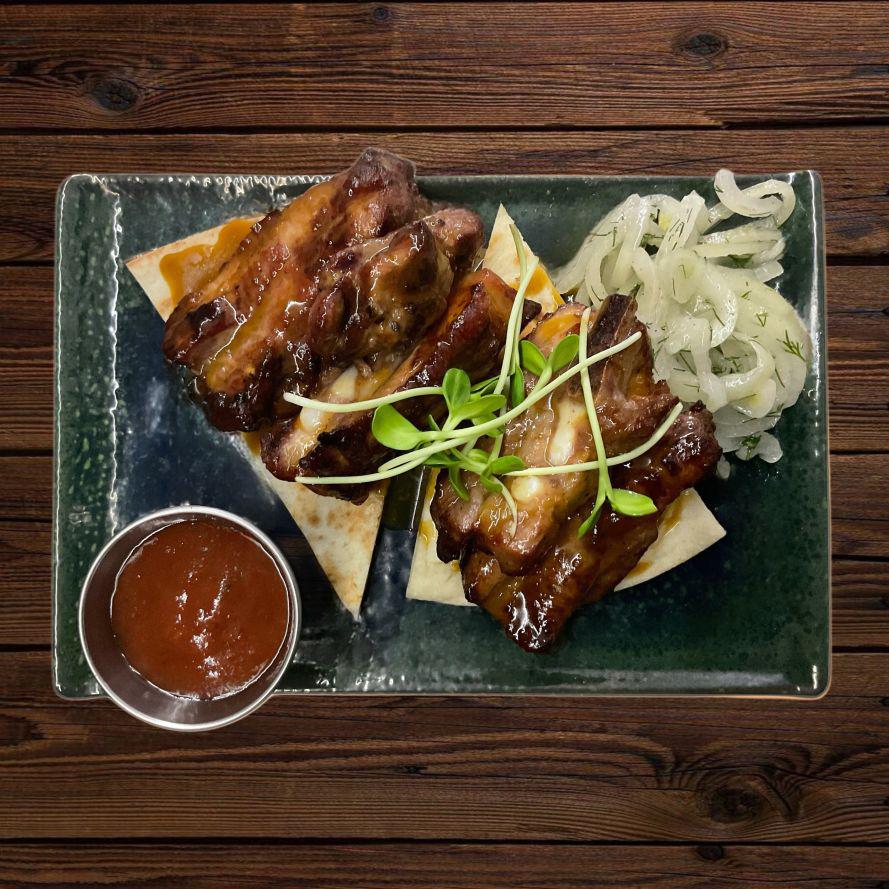 свиняча рулька, соуси шашличний, чилі та вершково-часниковий