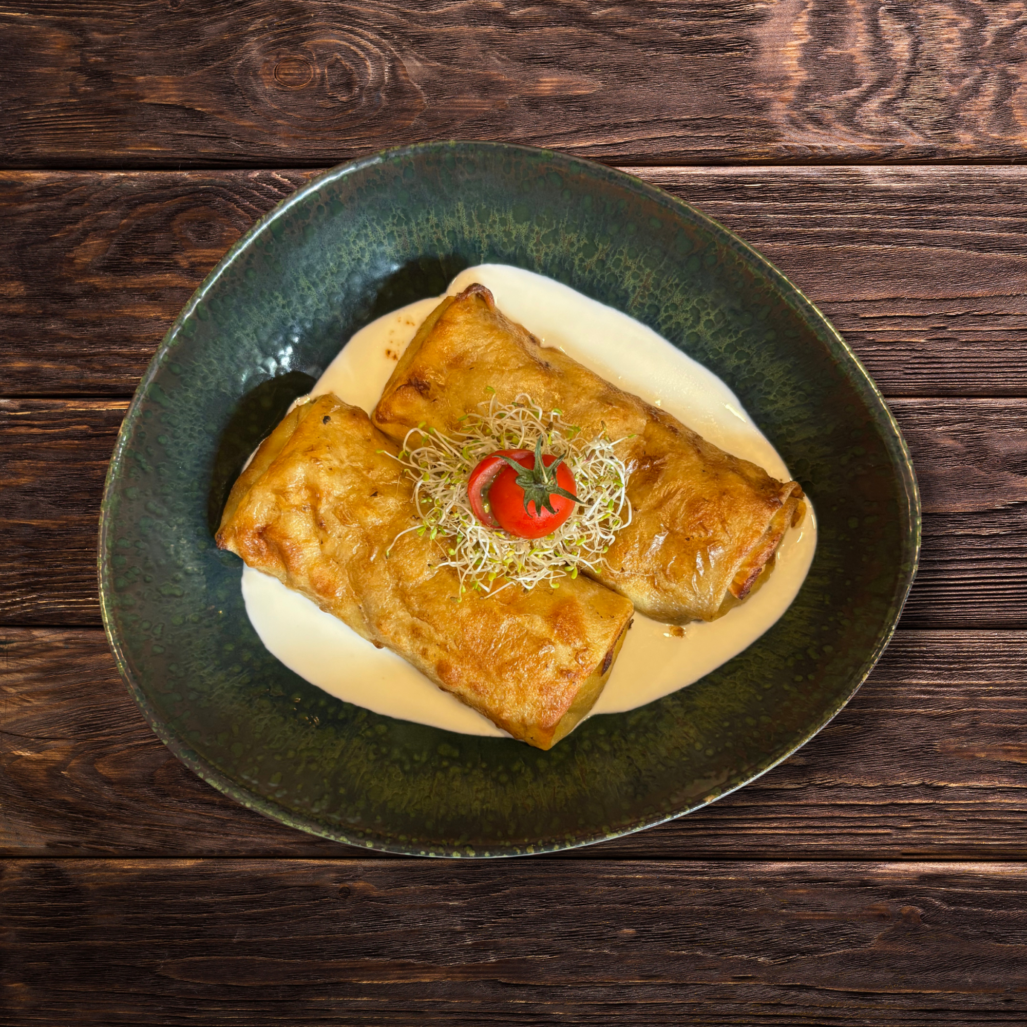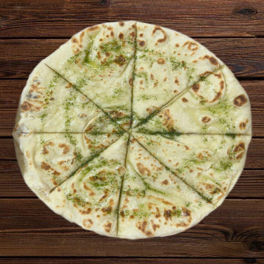 Лаваш, сулугуні, моцарела, помідора, зелень, вершково-часниковий соус