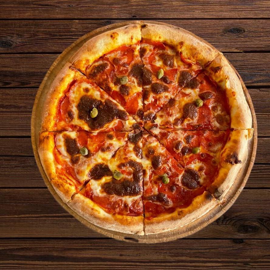 дор блю, моцарелла, огірок квашений, салямі, підчеревина копчена, томатна основа